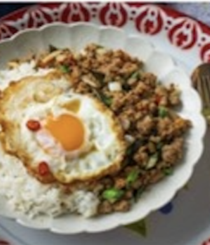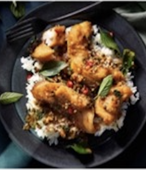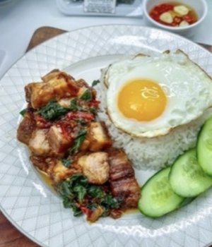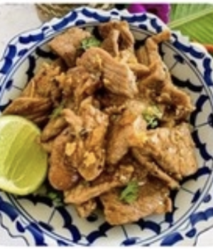 Crispy pork tossed with fragrant garlic, served with sticky rice.